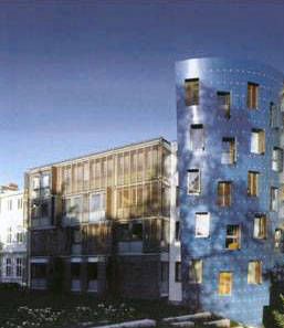 Projektleitung, Kostenplanung, Detailplanung/ Ausführungsplanung, Fassadenentwurfsplanung. Vorhangfassade aus vorgebogenen 3mm starken pulverbeschichteten Aluminiumtafeln, Fassade mit Schiebeelemnten aus Zedernholz